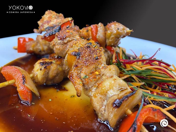 3 piezas de brochetas de pollo bañada en salsa teriyaki y shichimi togarashi