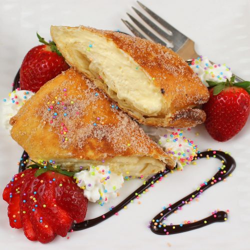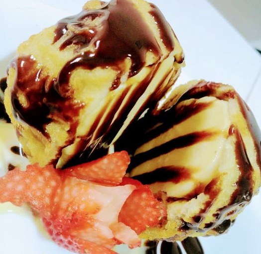Choux relleno de helado de vainilla al tempura, bañado con salsa de fresa, chocolate o cajeta.