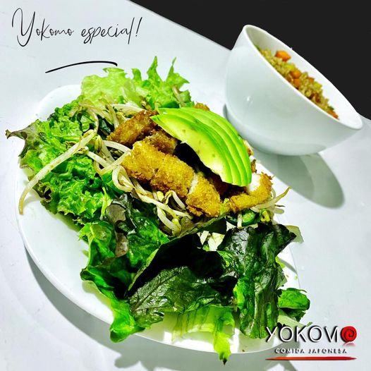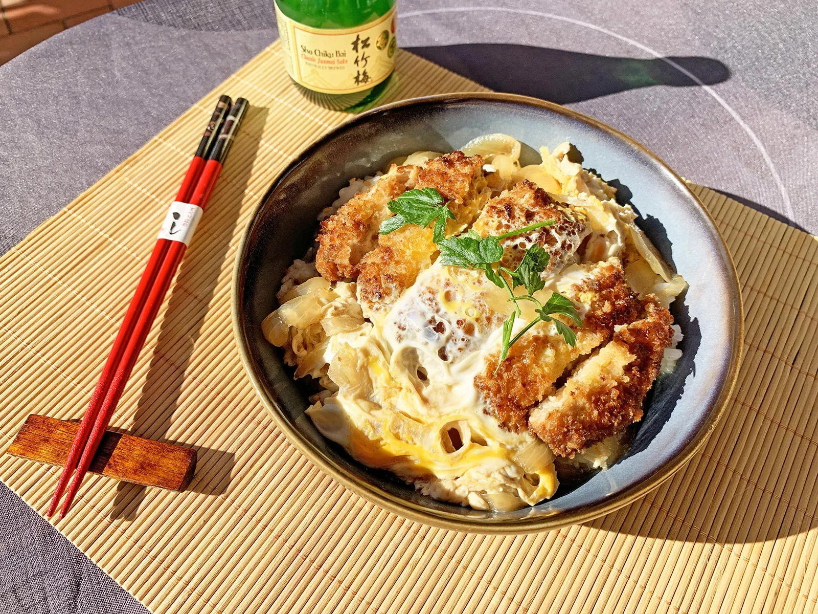 Lomo de cerdo o pollo empanizado, huevo, espinaca y cebolla, bañado con salsa udon, sobre una cama de gohan con cebollín espolvoreado.