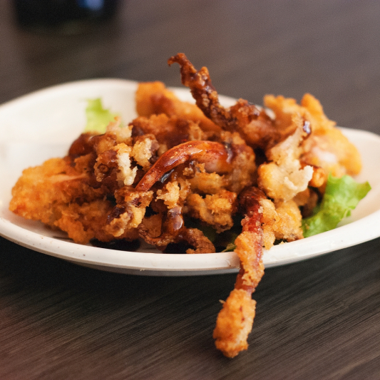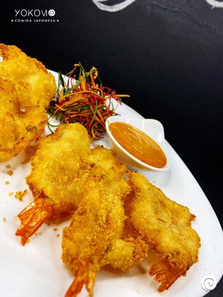 Camarones capeados, rellenos de queso Philadelphia, acompañados de aderezo chipotle.