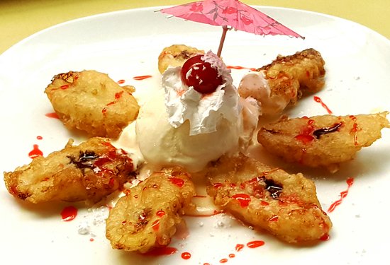 Plátano al tempura con helado de vainilla, bañado con salsa de fresa chocolate o cajeta.