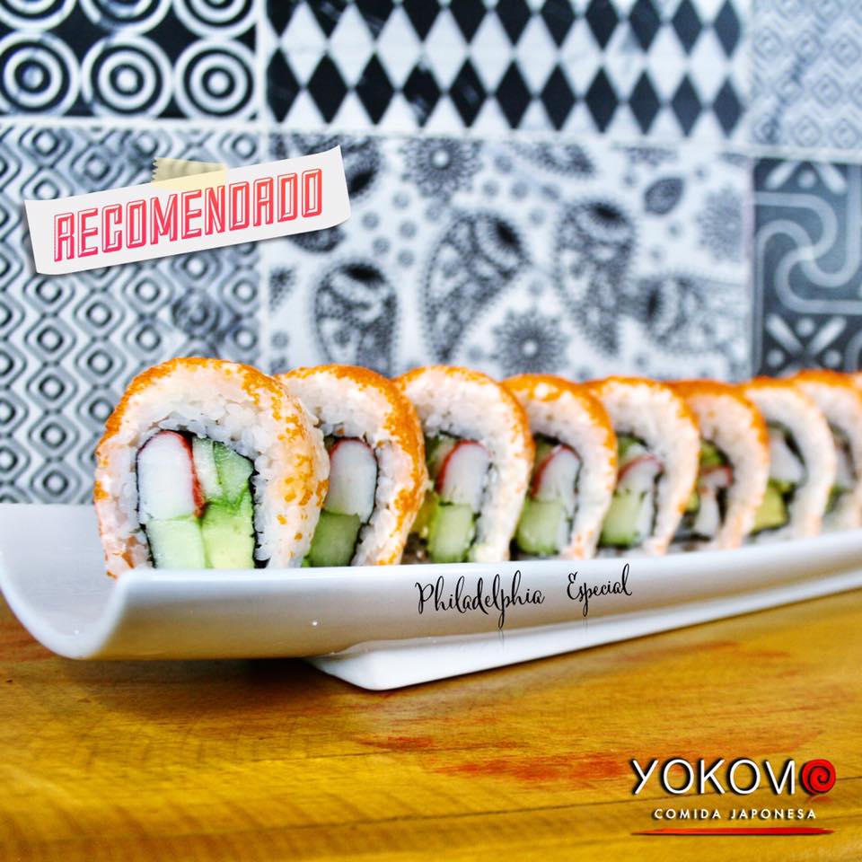 Alga, aguacate, surimi, pepino y queso Philadelphia por fuera.