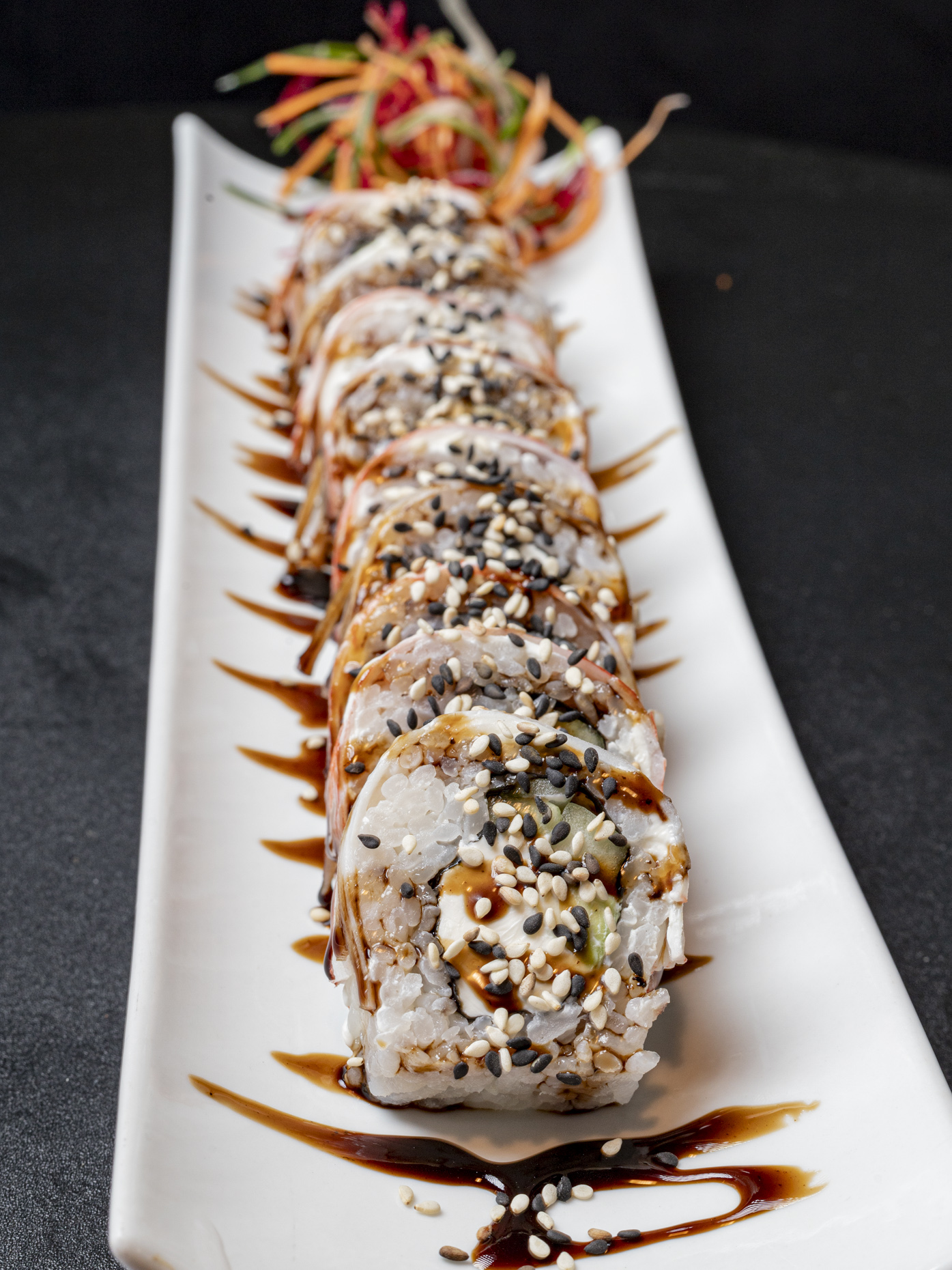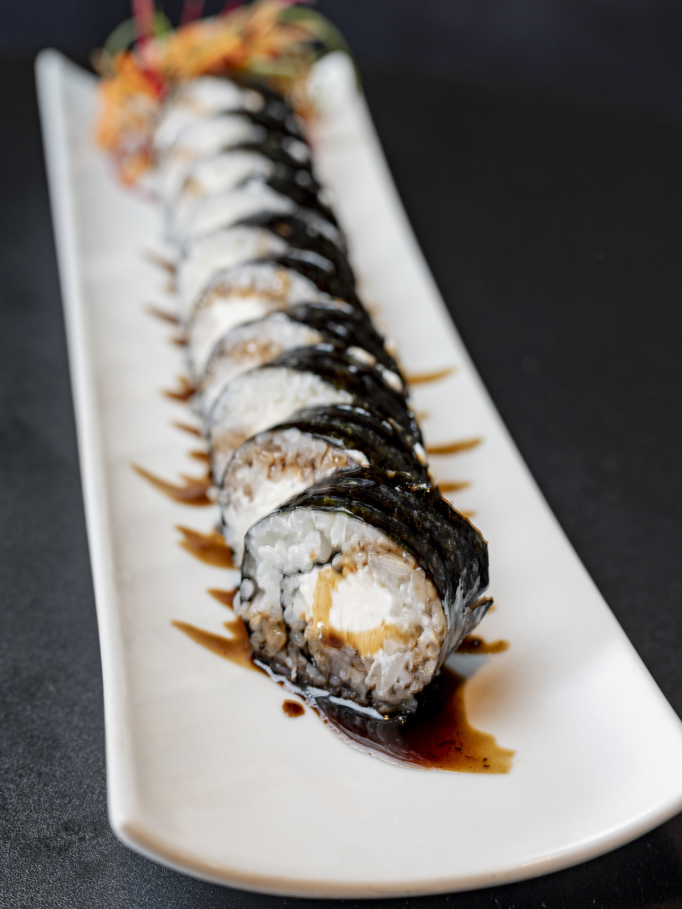 Alga, aguacate, queso Philadelphia, pepino, salmón fresco, camarón, cangrejo, masago, pulpo, alga por fuera, bañado en salsa de anguila.