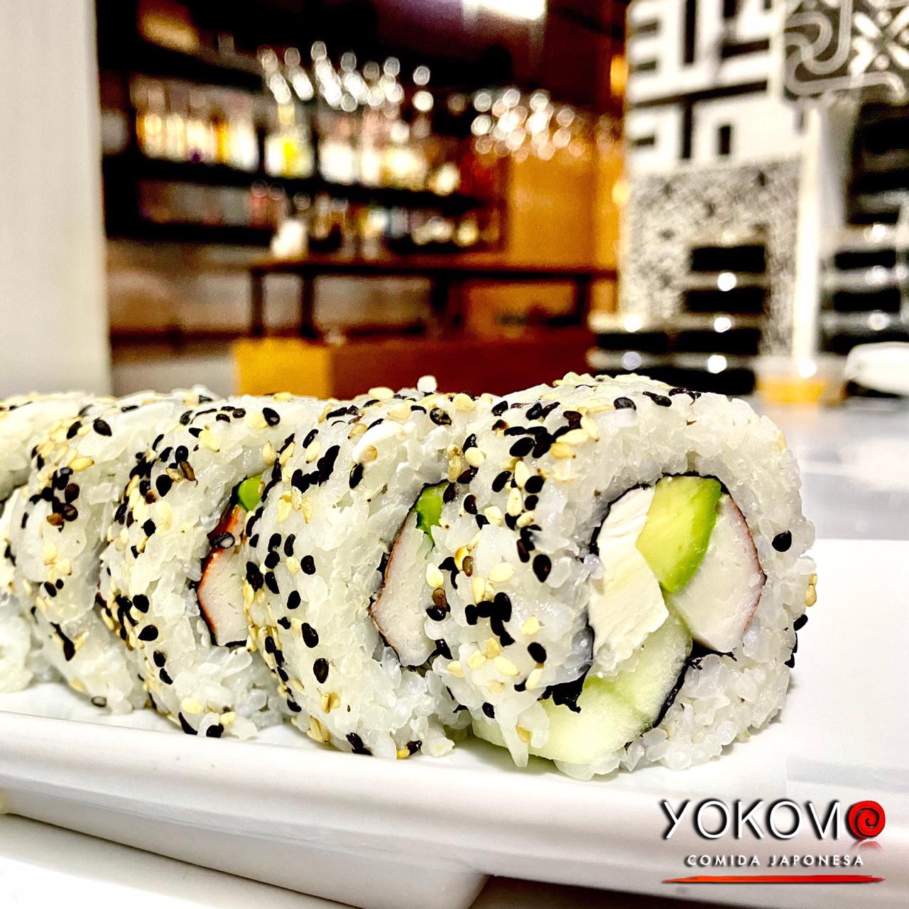 Alga, aguacate, queso Philadelphia, pepino, surimi, ajonjolí por fuera.