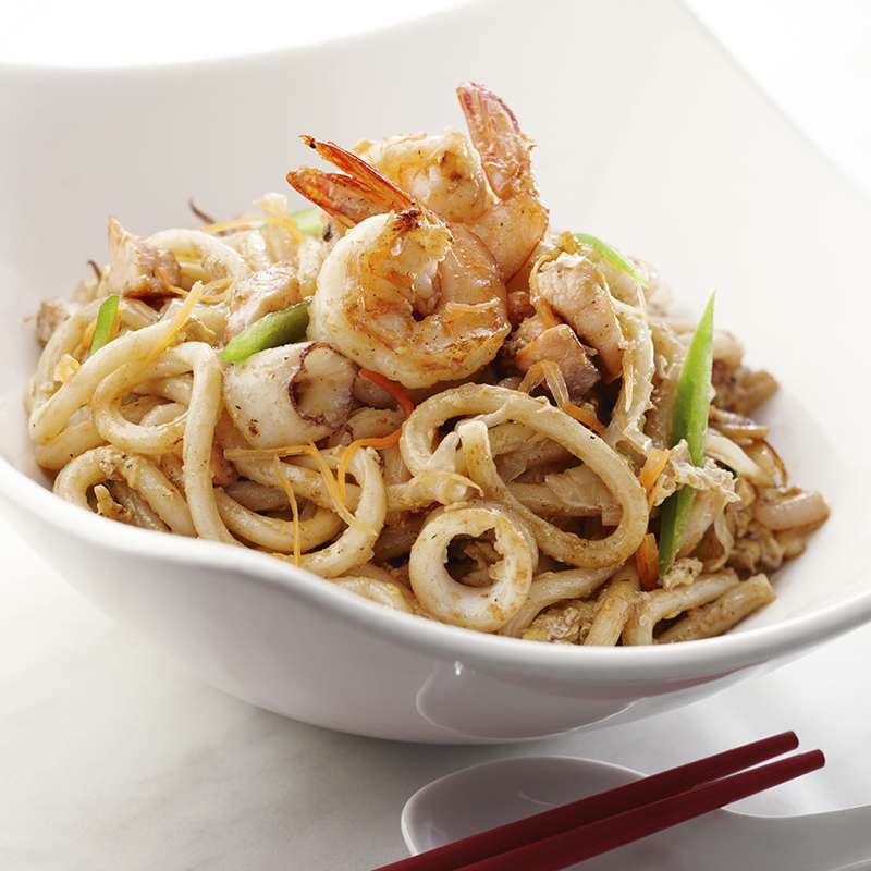 Tallarín grueso, cebollín, champiñón, camarón y pescado, en salsa de sake.