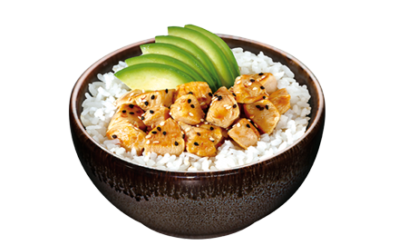 Arroz importado al vapor con fajitas de pollo empanizadas y salsa tonkatsu.