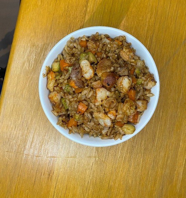 Arroz frito a la plancha, con zanahoria calabaza, cebolla, germen de soya, pimiento, champiñones, pollo, arrachera y camarón.