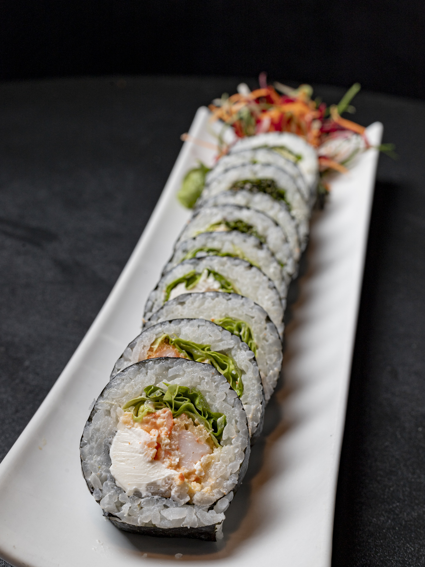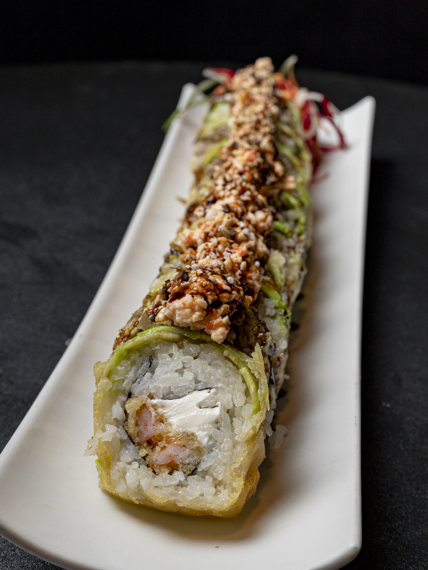 Alga, aguacate, camarón empanizado, chiles toreados, queso Philadephia por fuera y aderezo chipotle.
