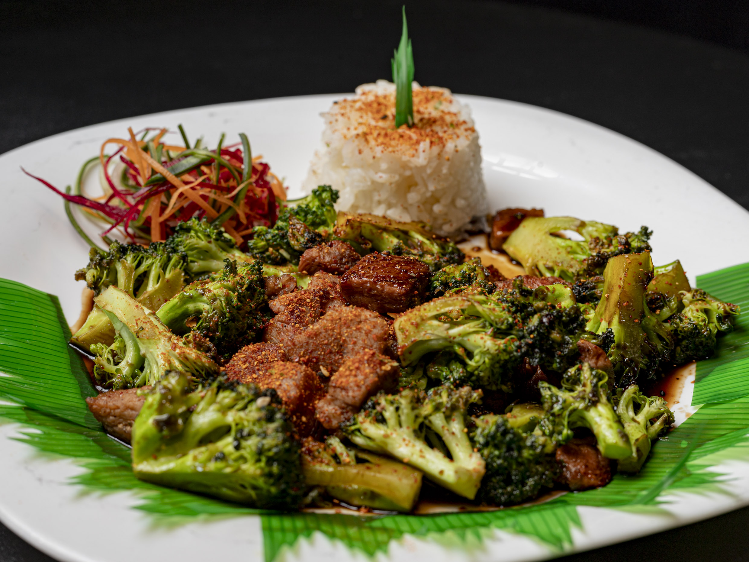 Acompañado de brócoli en salsa teriyaki, con arroz importado el vapor.