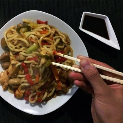 Tallarín grueso, cebollín, champiñón, calabaza, zanahoria y pollo en salsa teriyaki con ajonjolí espolvoreado.