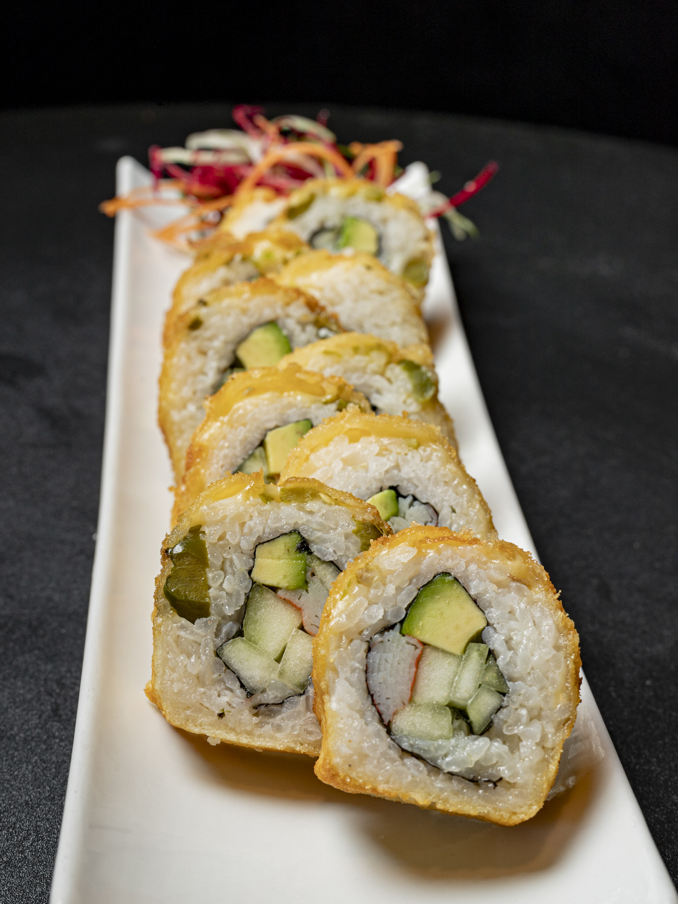 Alga, aguacate, pepino, cangrejo, queso manchego, chiles toreados, empanizados por fuera.