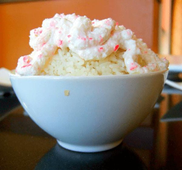 Arroz importado al vapor, con furikake ( condimento) de salmón y camarón.