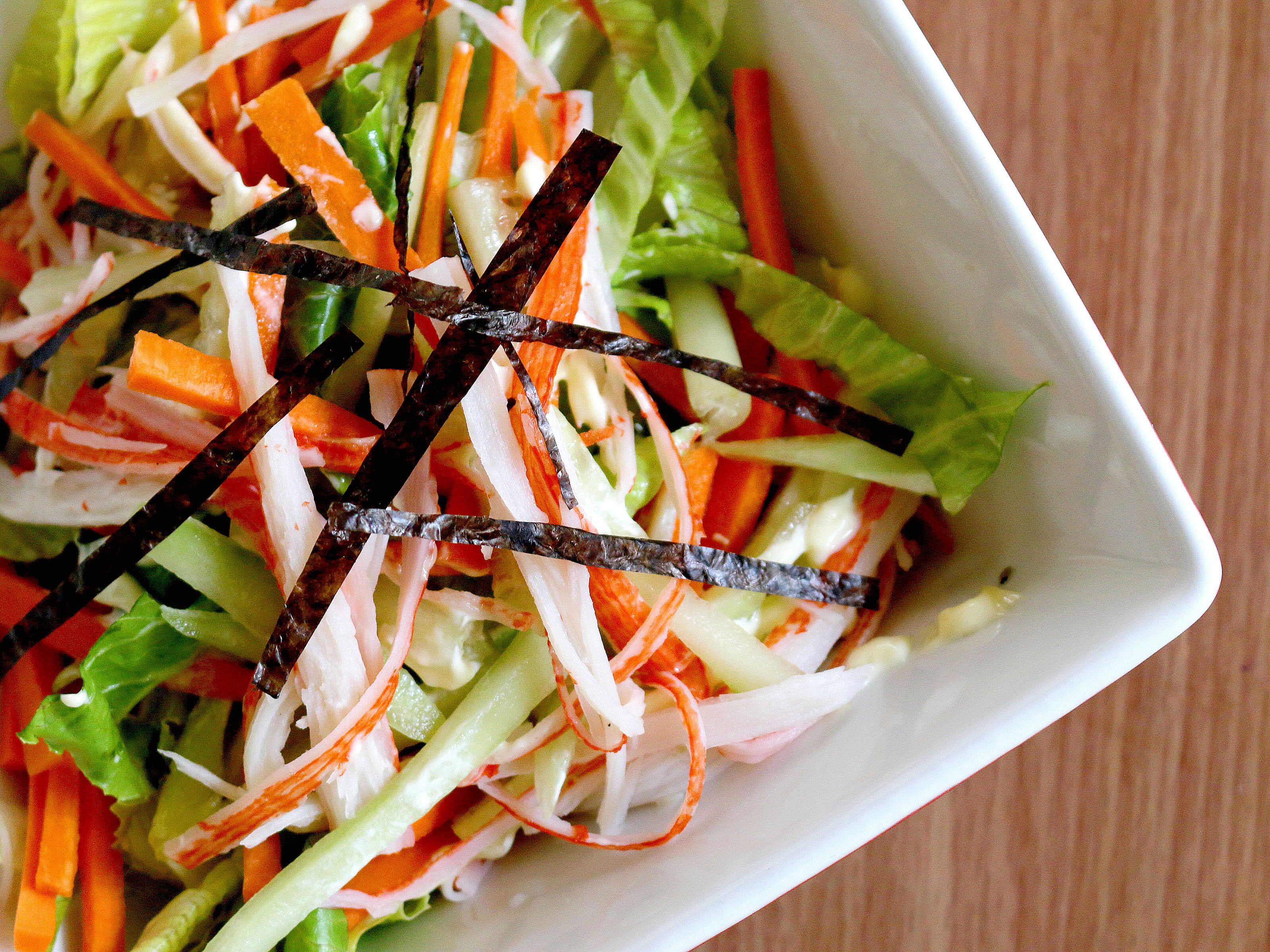 Pepino cangrejo y harusame bañado con vinagreta y ajonjolí