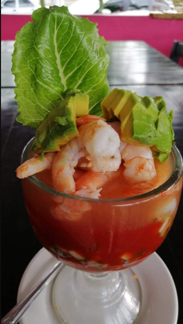 Camarón, pepino, cebolla, aguacate, jitomate, salsas de la casa y picante.