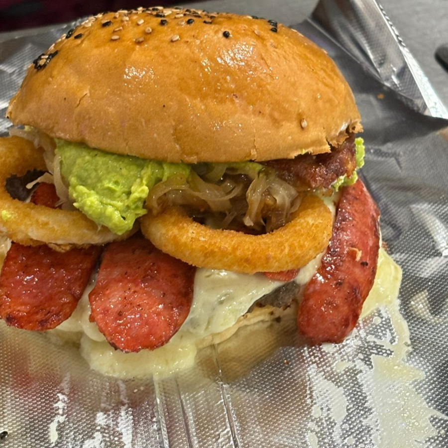 Delicioso pan artesanal, (140gr) carne homemade de ANGUS, queso cheddar, gratinado, chorizo, aguacate, queso suizo, aros de cebolla.