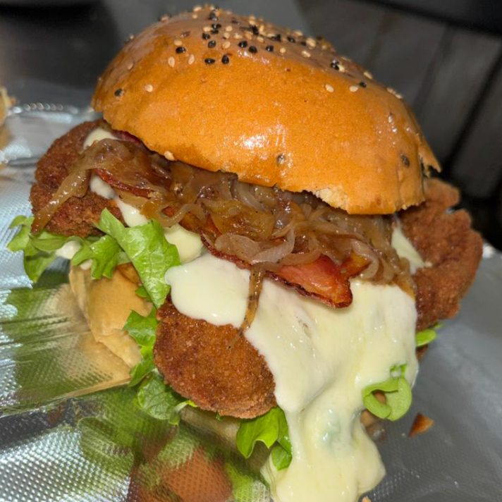 Delicioso pan artesanal, (120gr) pollo fresco, queso cheddar gratinado, tocino, queso suizo, jitomate, cebolla, lechuga.