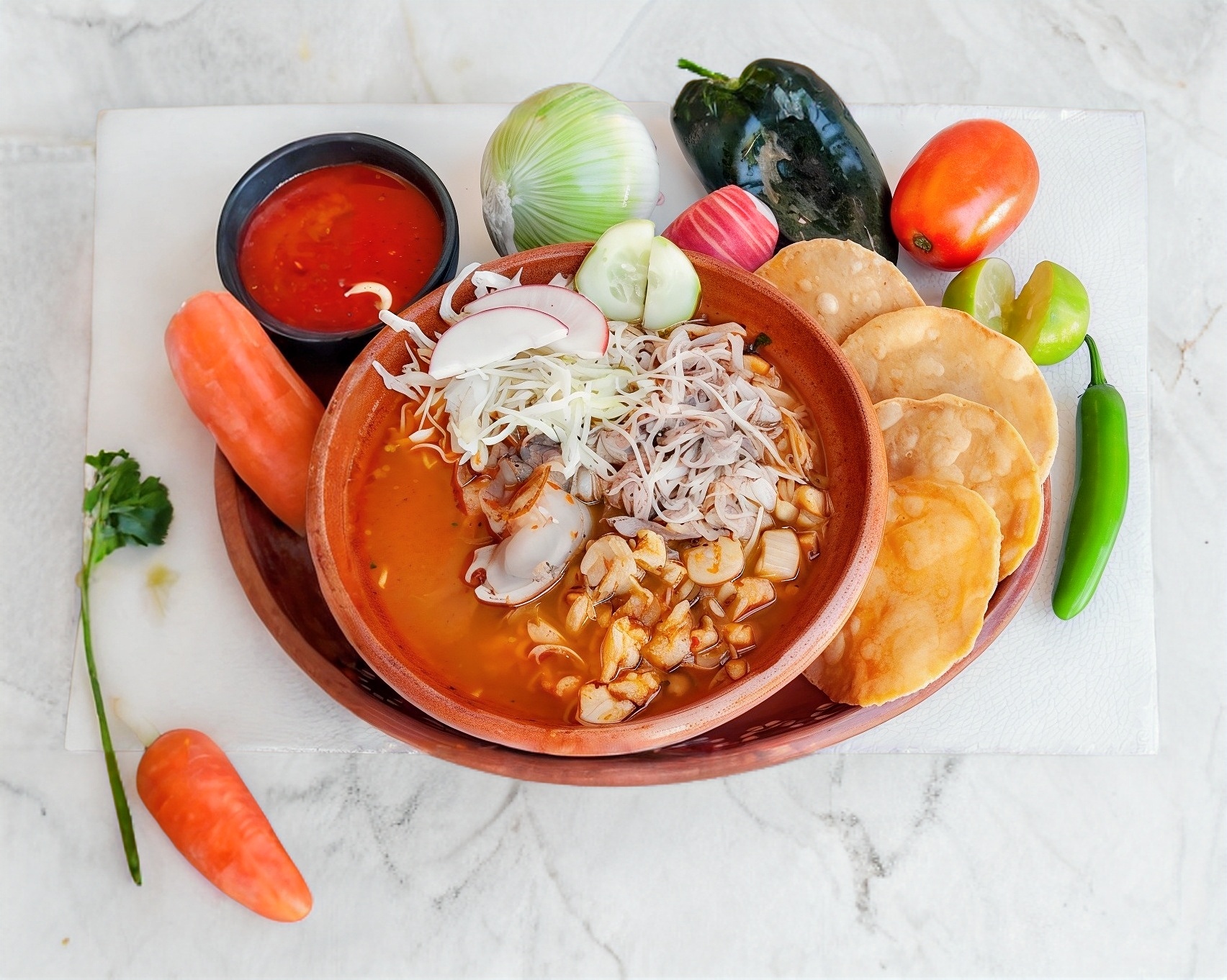 Pozole rojo acompañado de su carne preferida y 3 doraditas recién hechas.