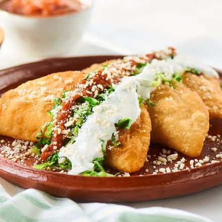 Riquísima quesadilla frita tipo empanada con relleno a su elección acompañadas de lechuga, salsa de jitomate, crema, queso y salsa picante.