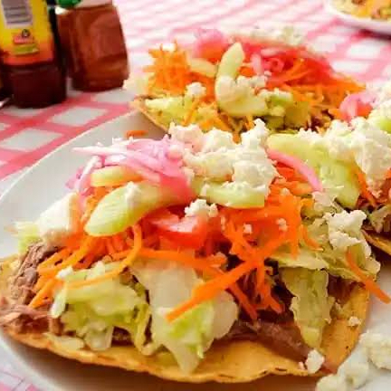Riquísima Tostada de 15 cm de diametro aprox, con base de frijoles y pollo acompañada de lechuga, salsa de jitomate, crema, queso y salsa picante.