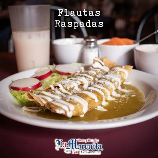 Riquísimas flautas de tortilla raspada de 25 cm aprox. con relleno a su elección acompañadas de lechuga, salsa de jitomate, crema, queso y salsa picante.