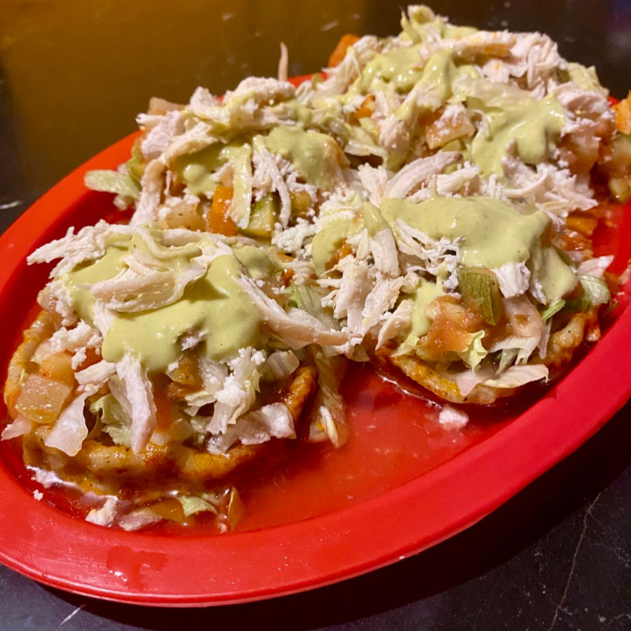 Torteados a mano, bañados de salsa y en la parte superior pollo deshebrado, lechuga, salsa de verduras y queso fresco.