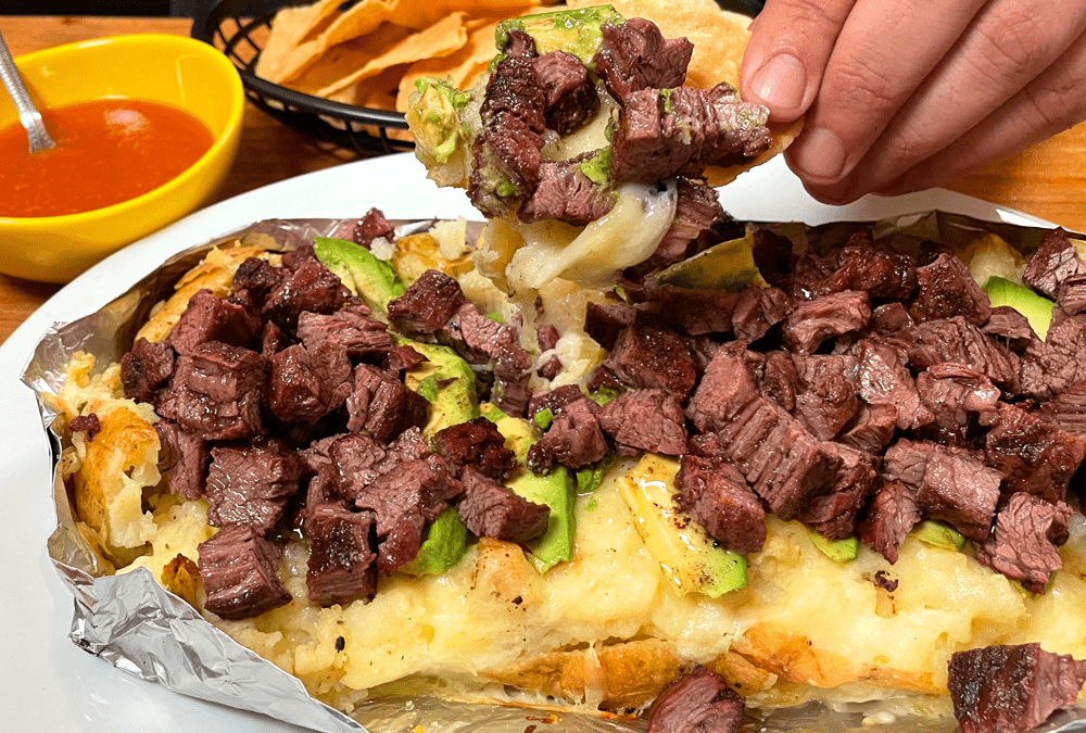 Una papa grande, suave y perfectamente horneada, con la piel doradita y crujiente por fuera, y por dentro un corazón que se mezcla con mantequilla y un toque de sal. Rellena hasta el tope con carne a tu elección, cocinada a fuego lento que la hacen irresistible. Encima, una lluvia generosa de queso derretido que se funde con la carne. ¡Una bomba de antojo que no se le niega a nadie!