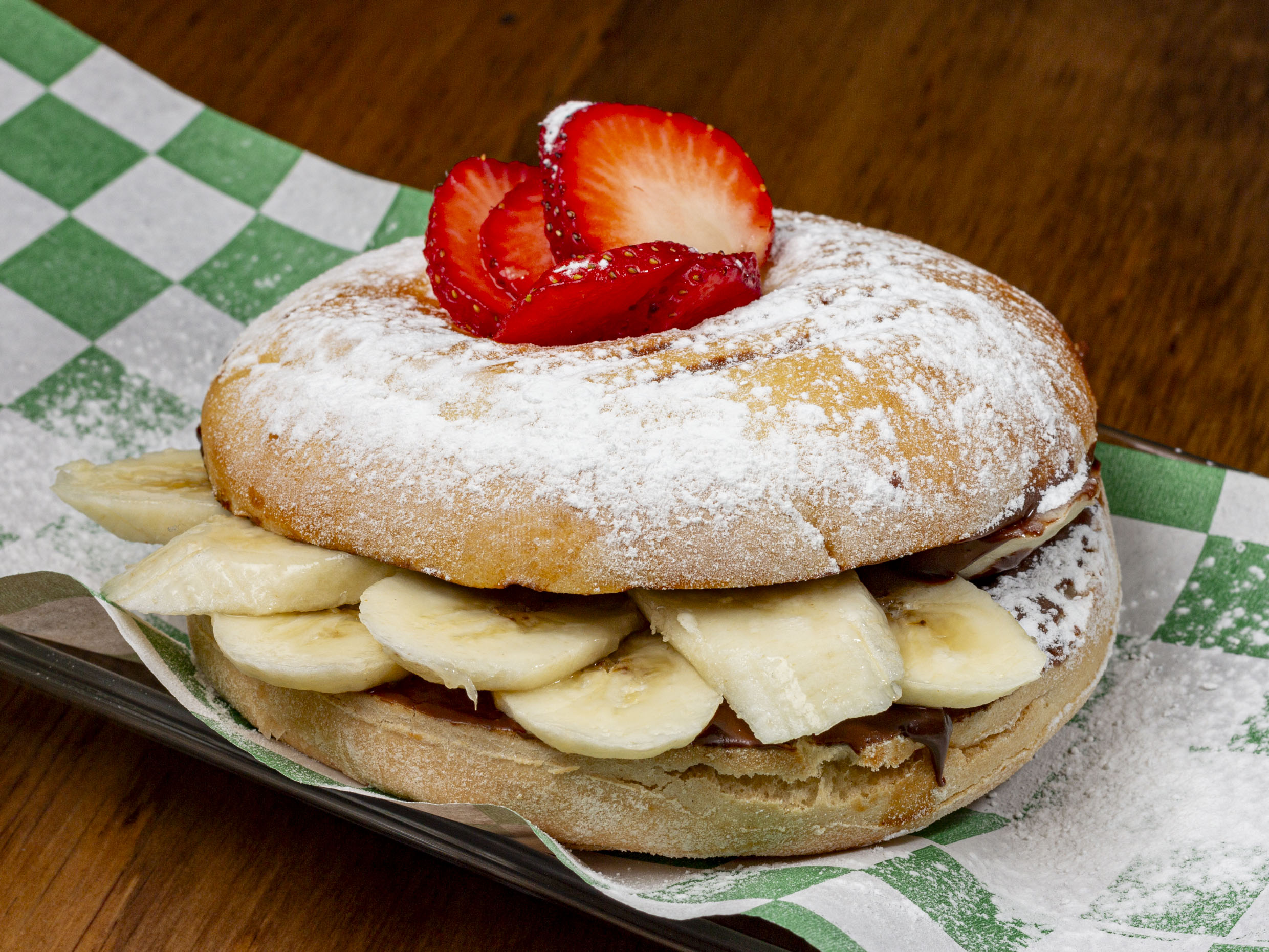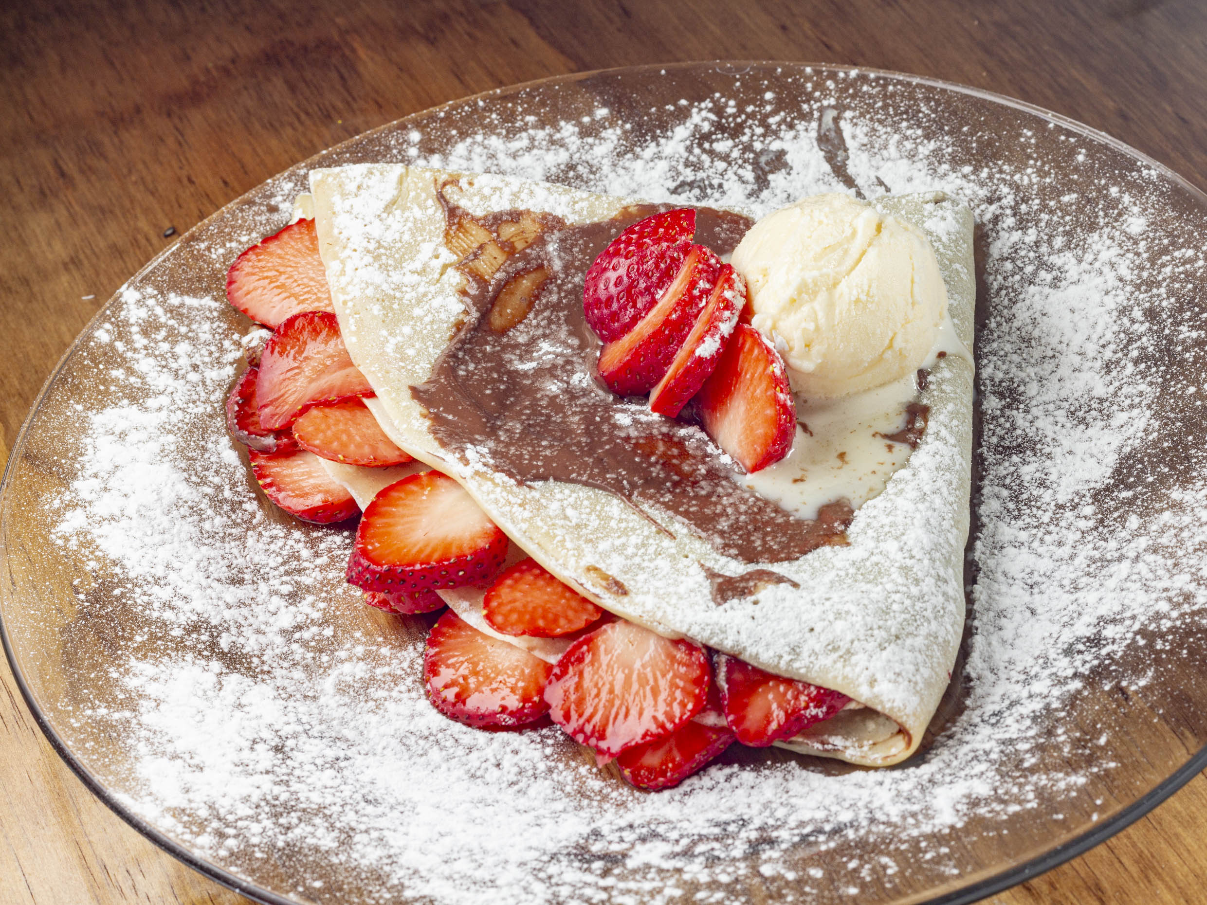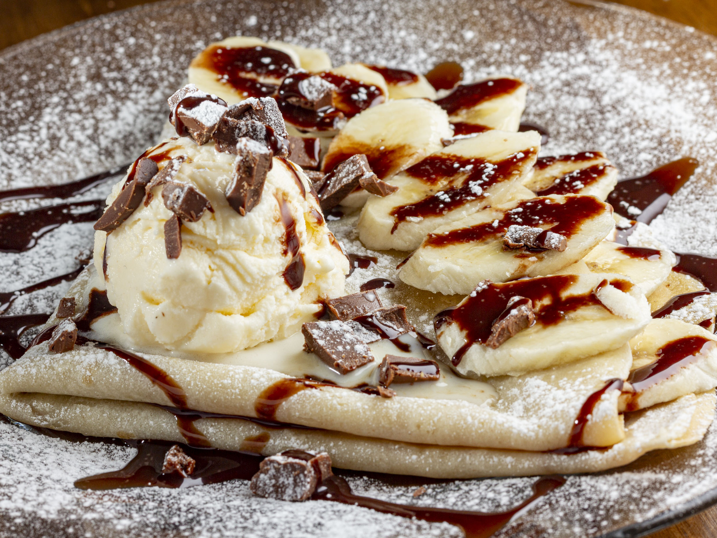 Con relleno a elegir, platáno o fresa, acompañado de queso crema y helado de vainilla.