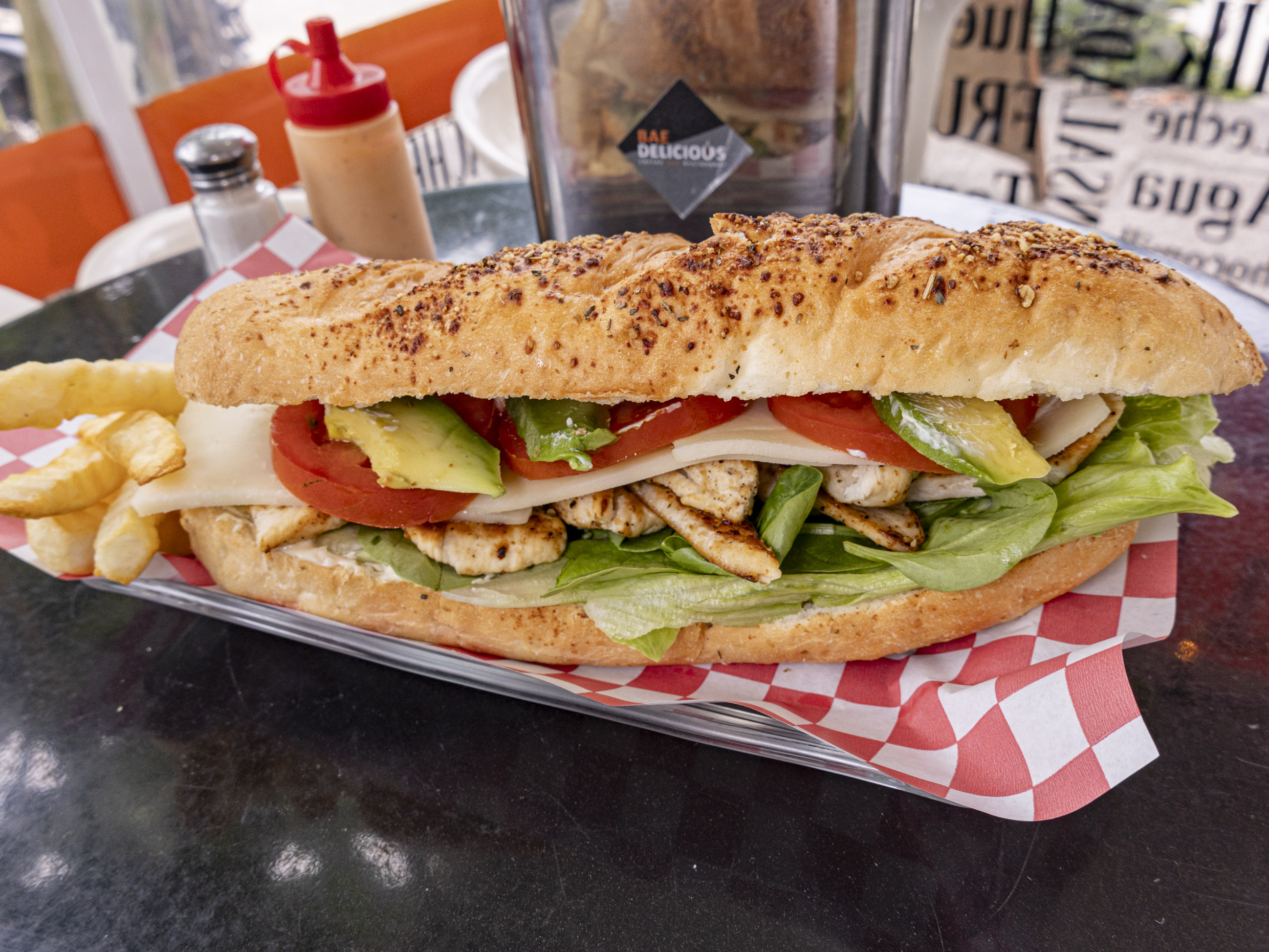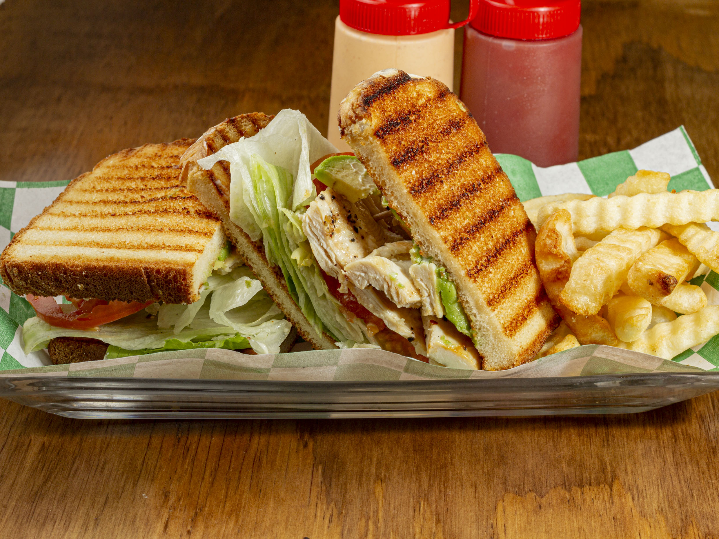 Pechuga de pollo a la plancha, queso manchego, lechuga, jitomate y aguacate.