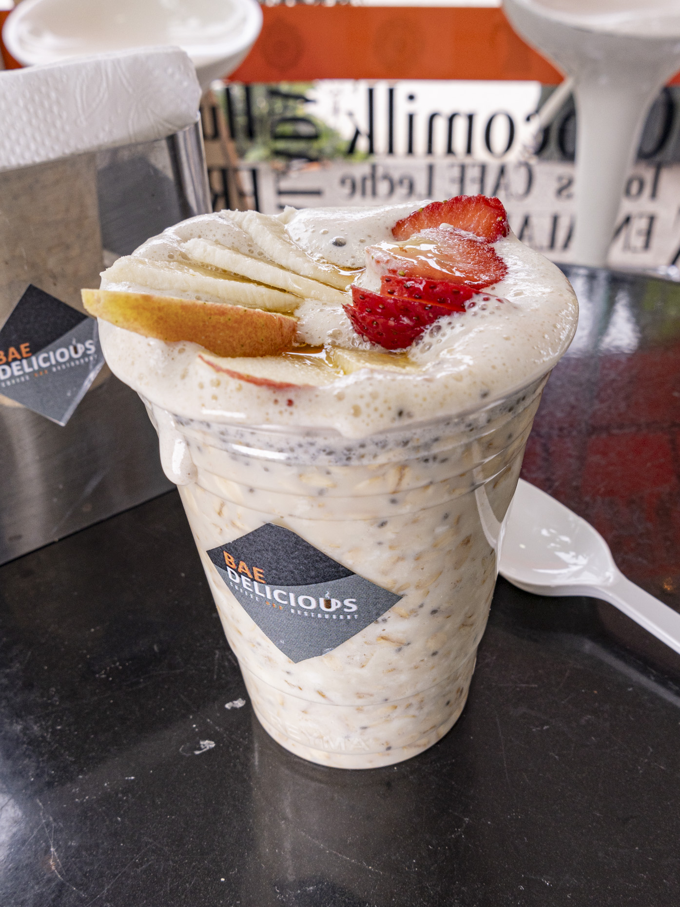 Leche de almendra, avena, chia, yogurt natural, vainilla, canela, pasas, manzana, fresa, platano y miel