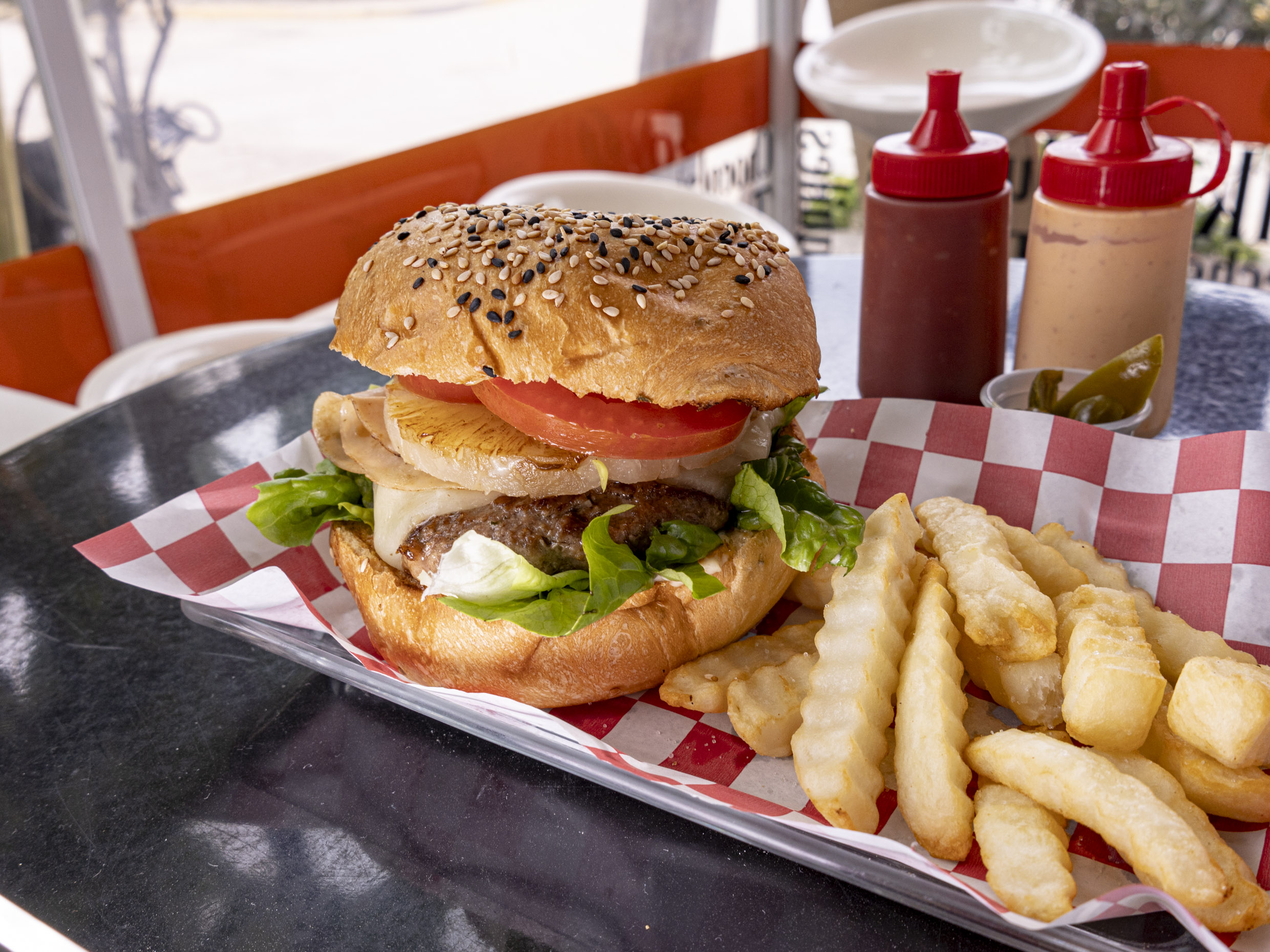 carne 100% res, queso, lechuga, jitomate, cebolla, pepinillos y papas fritas