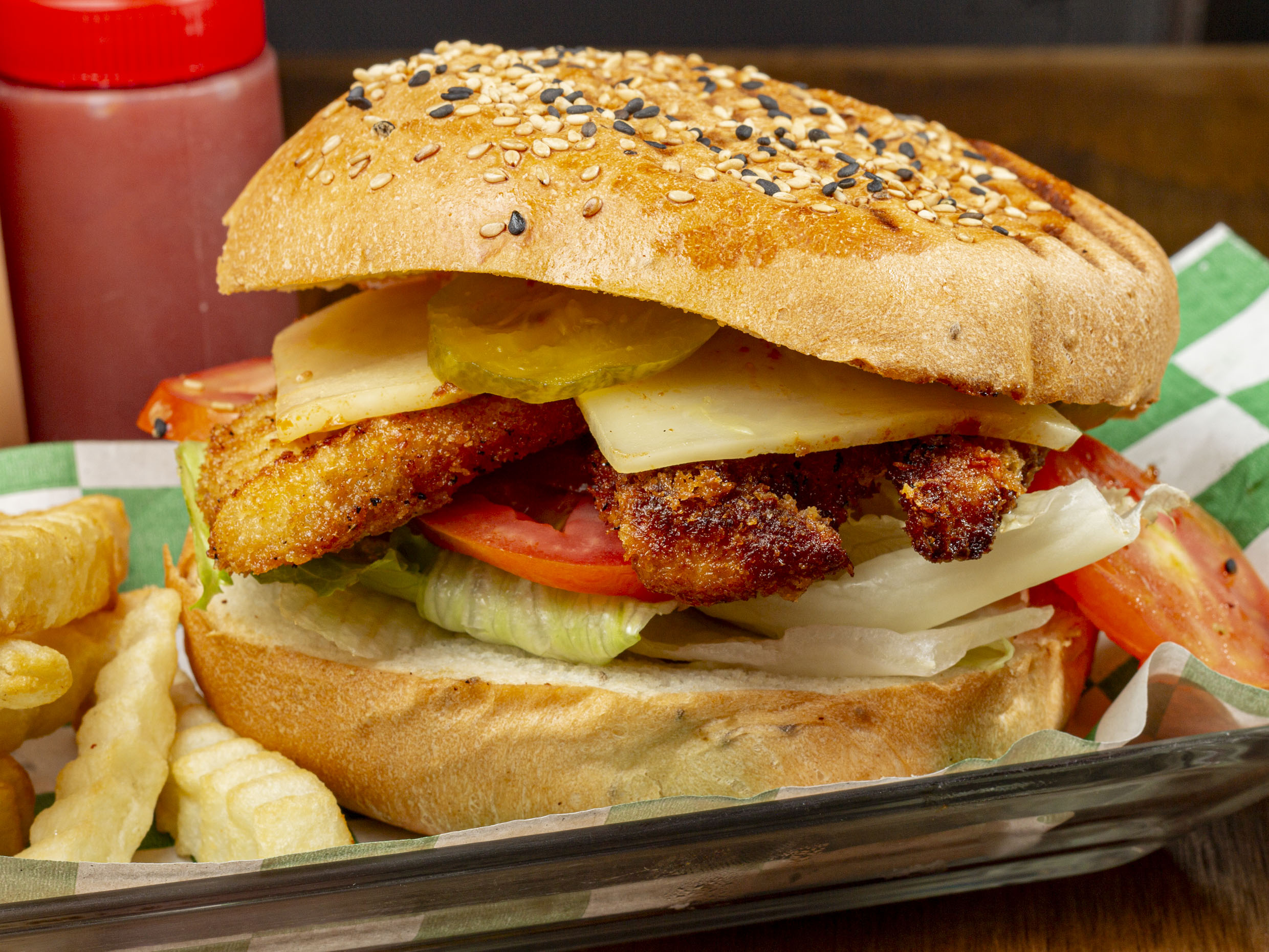 Pechuga de pollo empanizada con panko, aderezo de chipotle, queso, lechuga, jitomate
