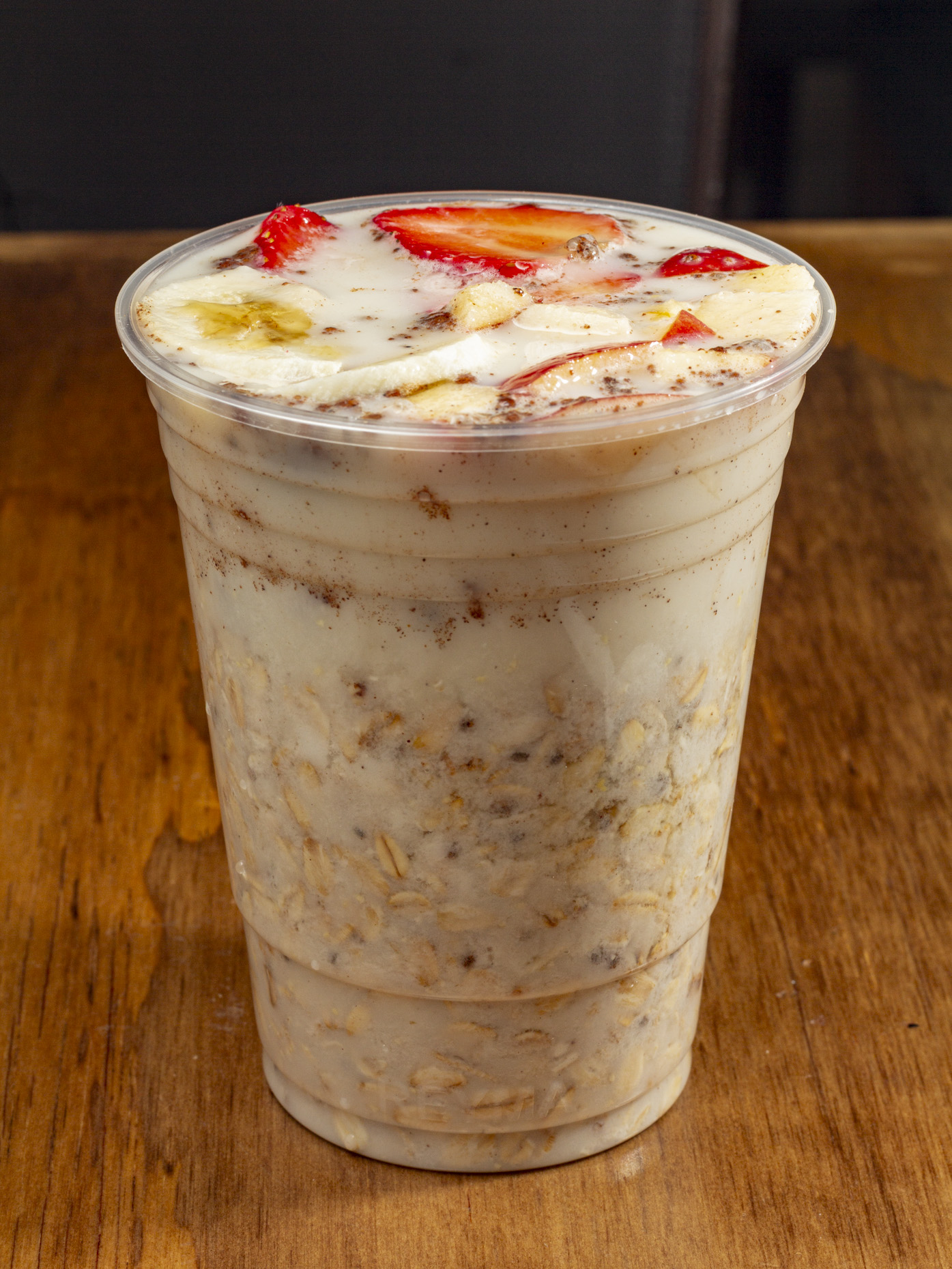 Leche de Soya, avena, chia, yogurt natural, vainilla, canela, pasas, manzana, fresa, platano y miel