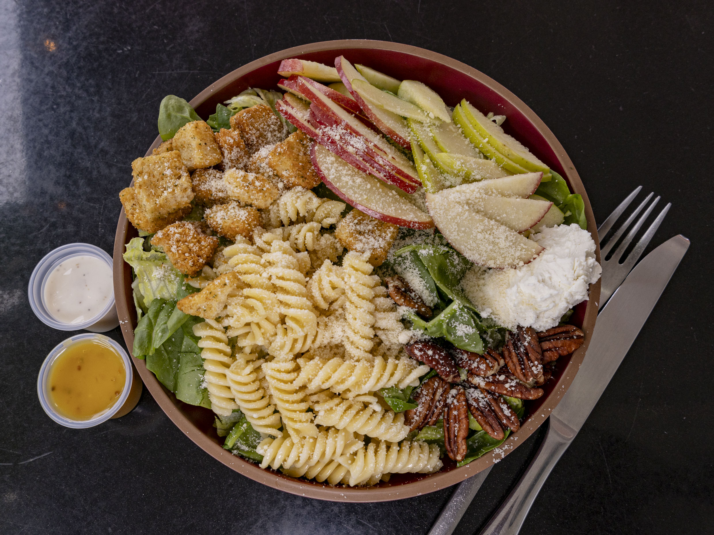 Lechuga italiana y orejona, espinaca, manzana gala, manzana verde, queso de cabra, nuez y pasta,crutones y queso parmesano.