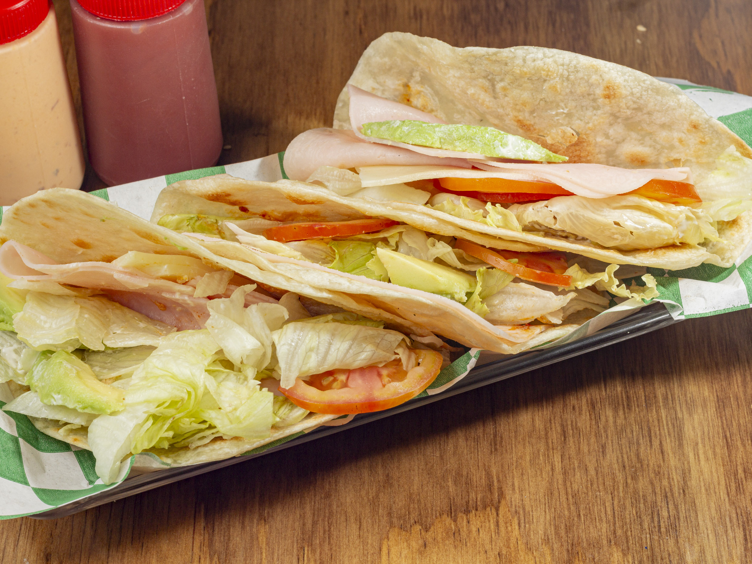 Quesadillas con jamon de pavo, queso manchego, lechuga, espinaca, jitomate y aguacate