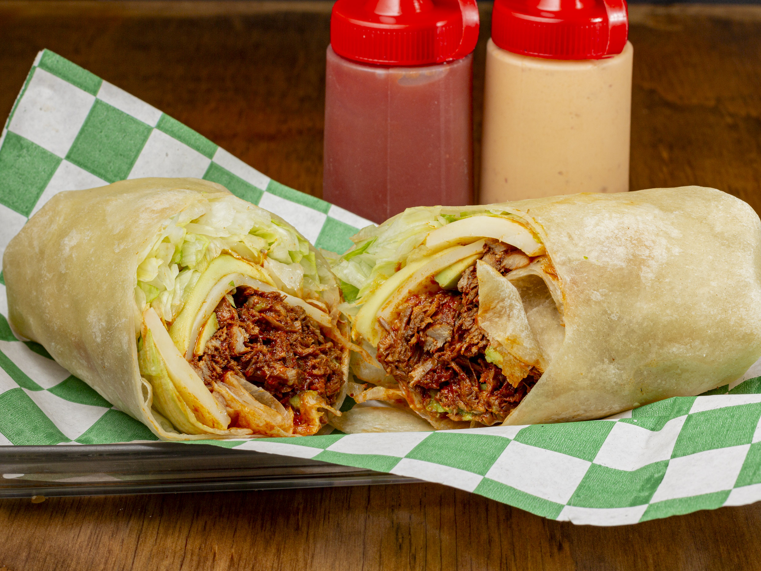 Tortilla de harina, pierna de cerdo, queso manchego, lechuga, jitomate, cebolla y aguacate