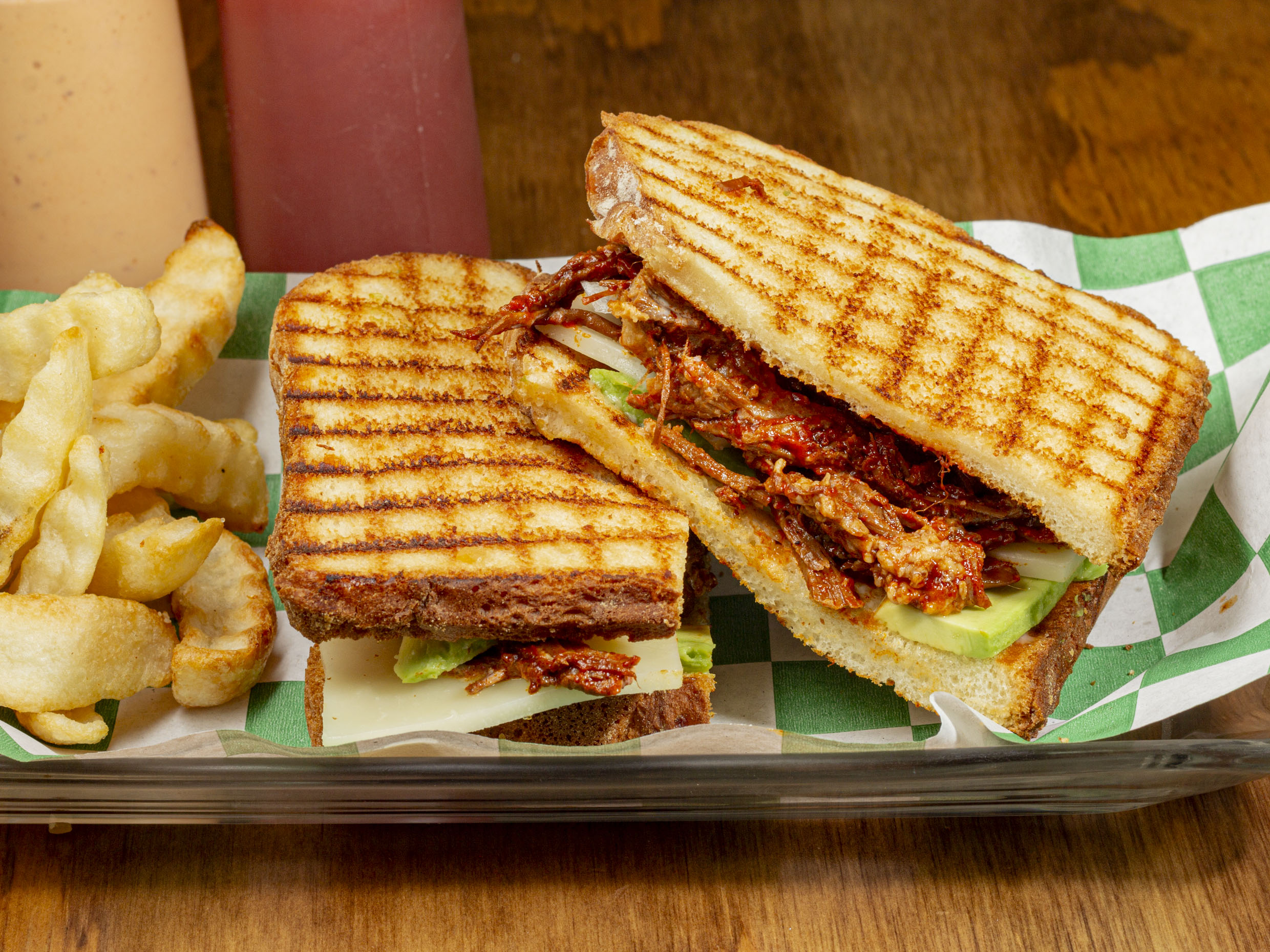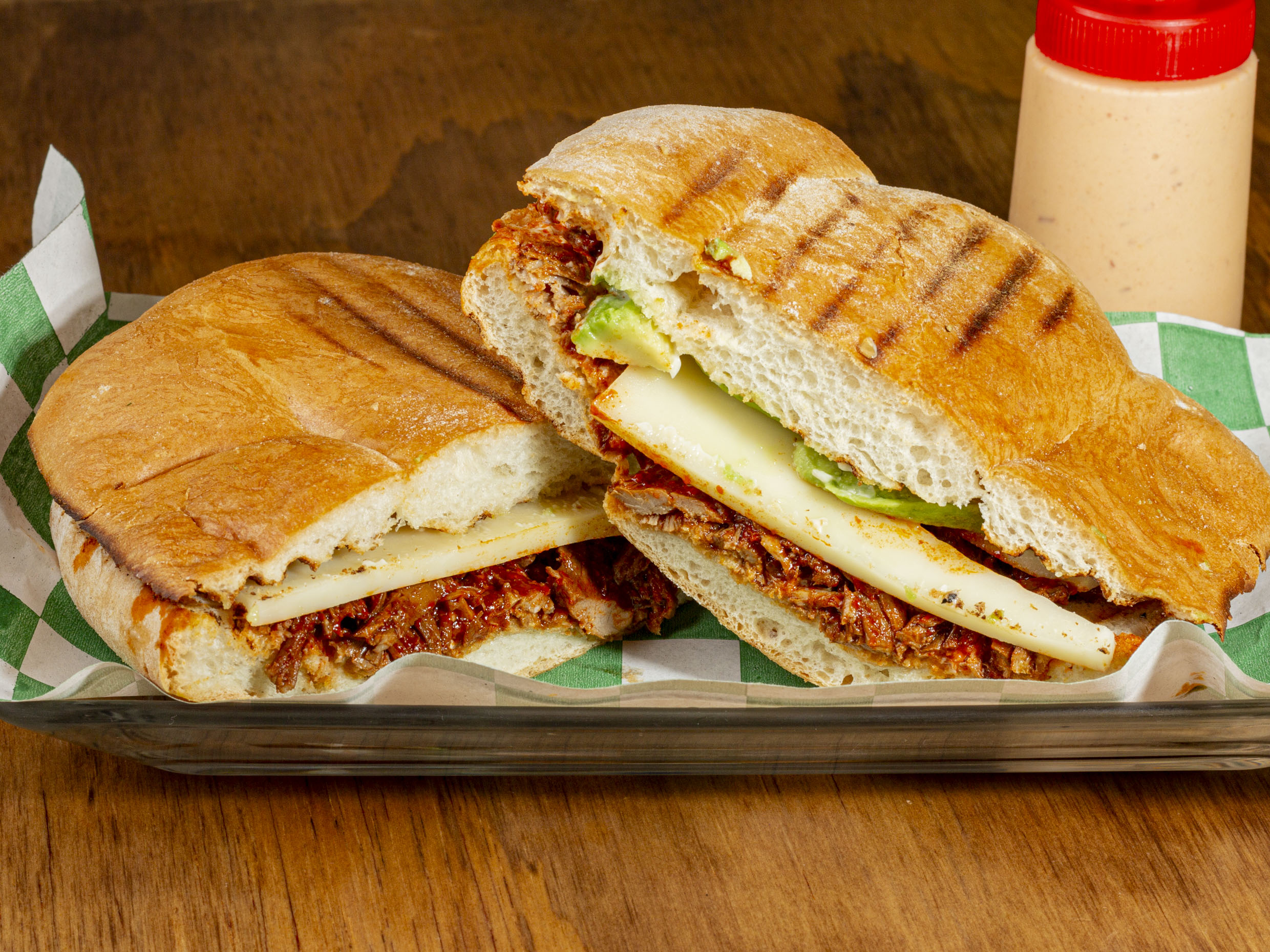 Pan de Telera, Pierna de cerdo, queso manchego, jitomate, lechuga, cebolla y aguacate.