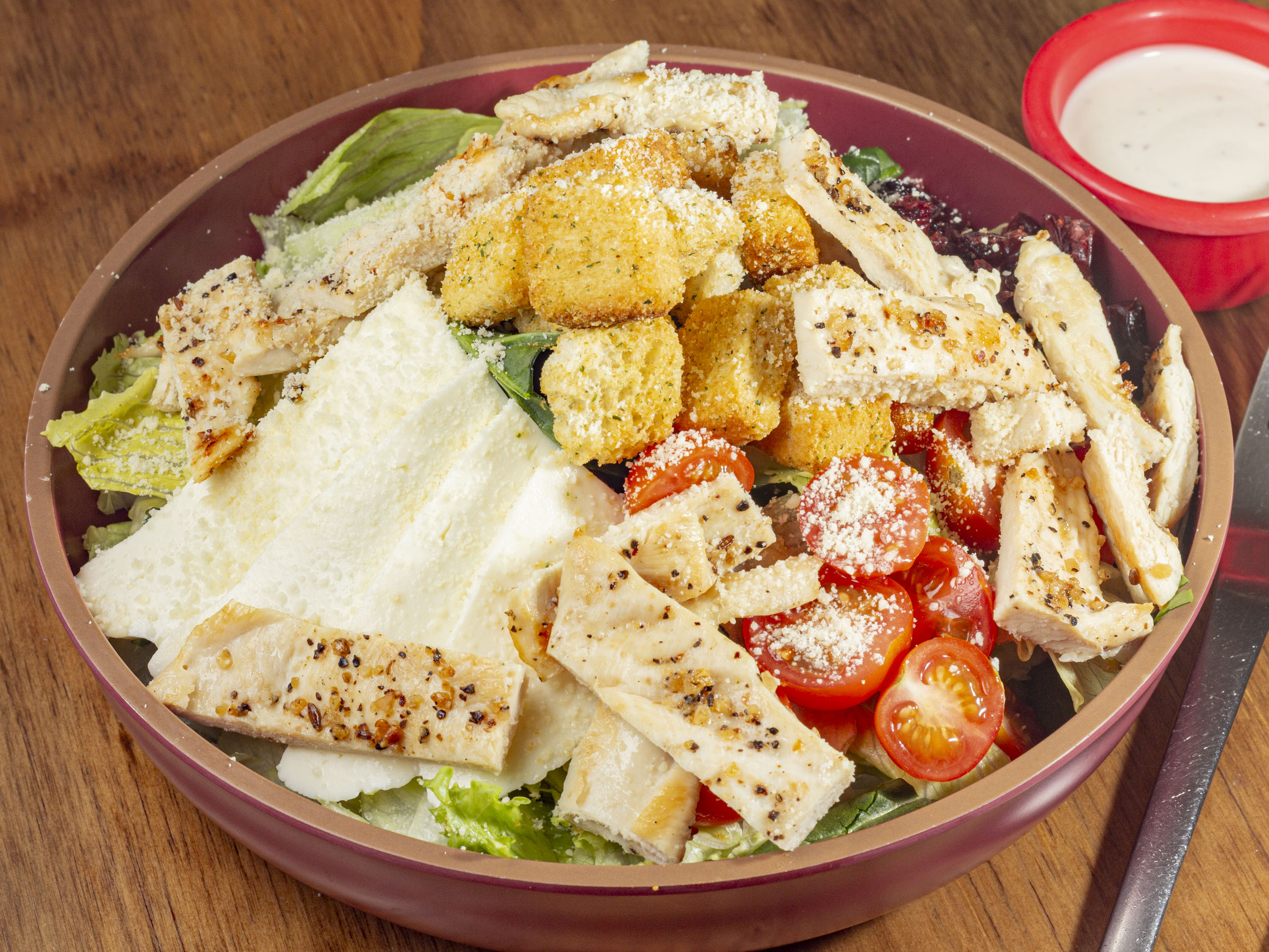 Lechuga orejona, aderezo cesar, crutones y queso parmesano.