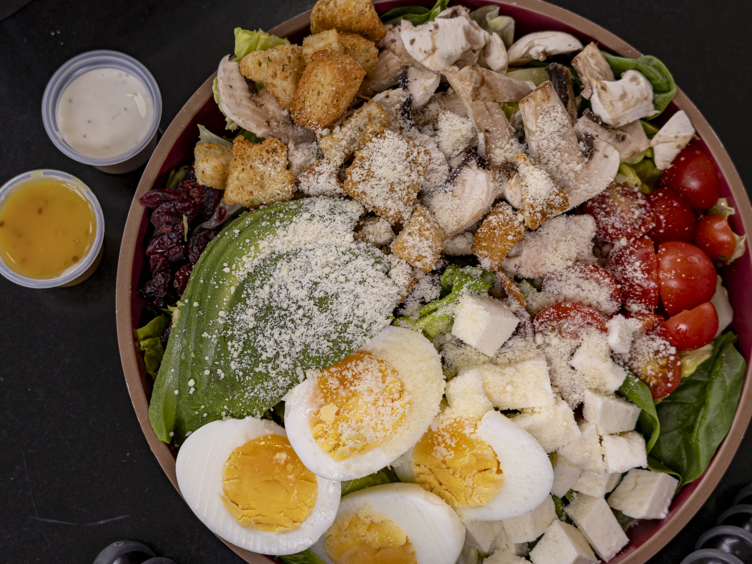 Lechuga orejona, lechuga italiana, espinaca, jitomate, champiñon, aguacate, arandano, panela y 2 huevos cocidos