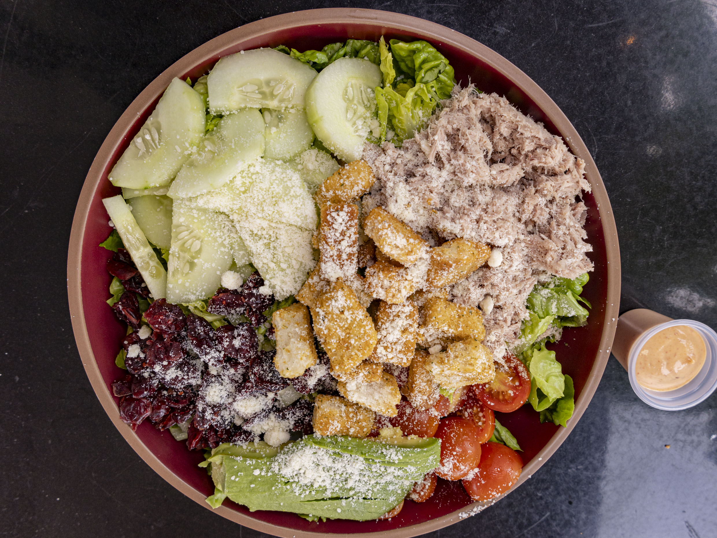 Mix de lechugas, atún, aguacate, jitomate, pepino, zanahoria, arandano y aderezos (chipotle y ranch)