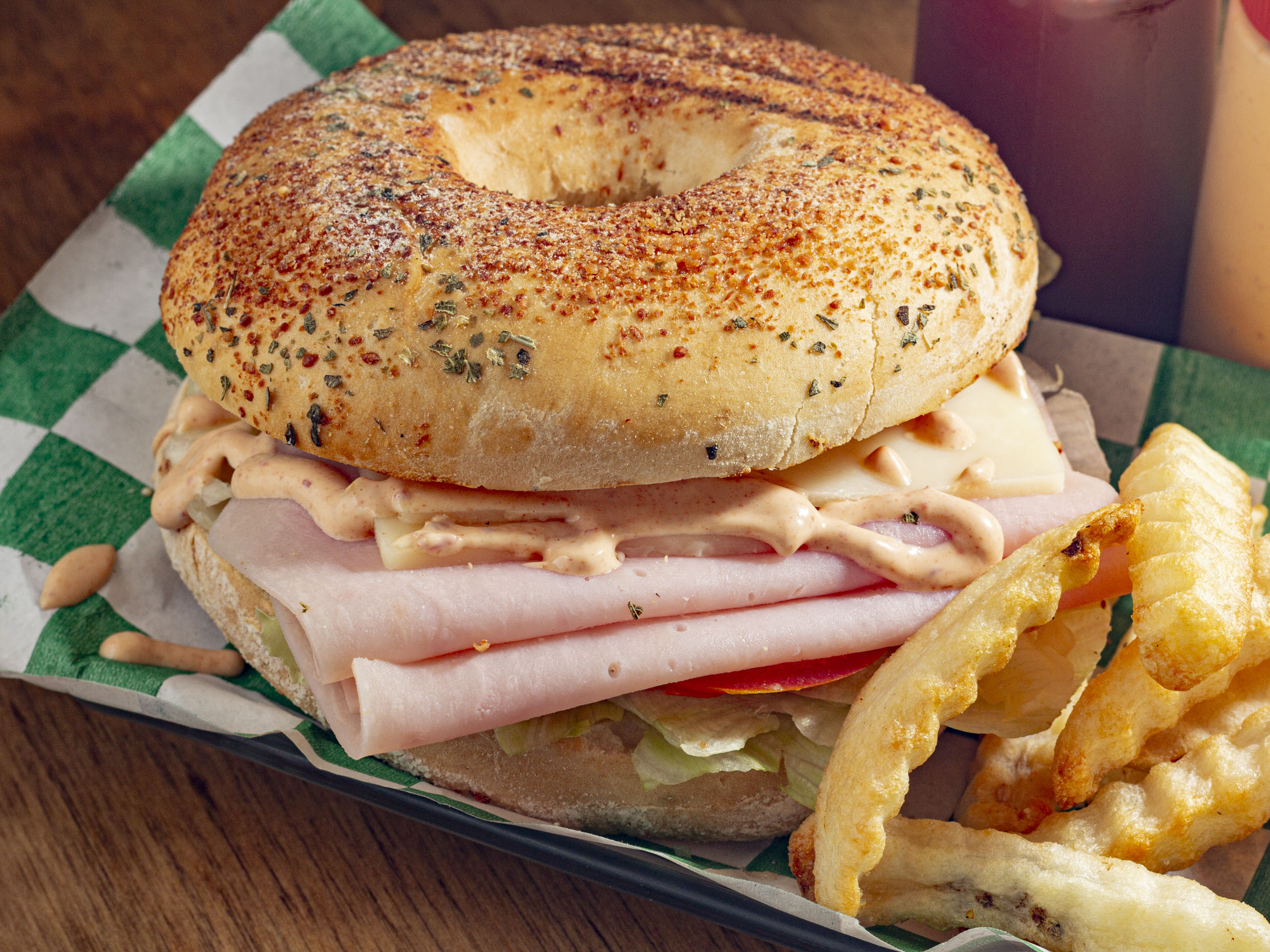 Jamón de pavo, queso manchego, lechuga, jitomate, espinaca y aderezo chipotle