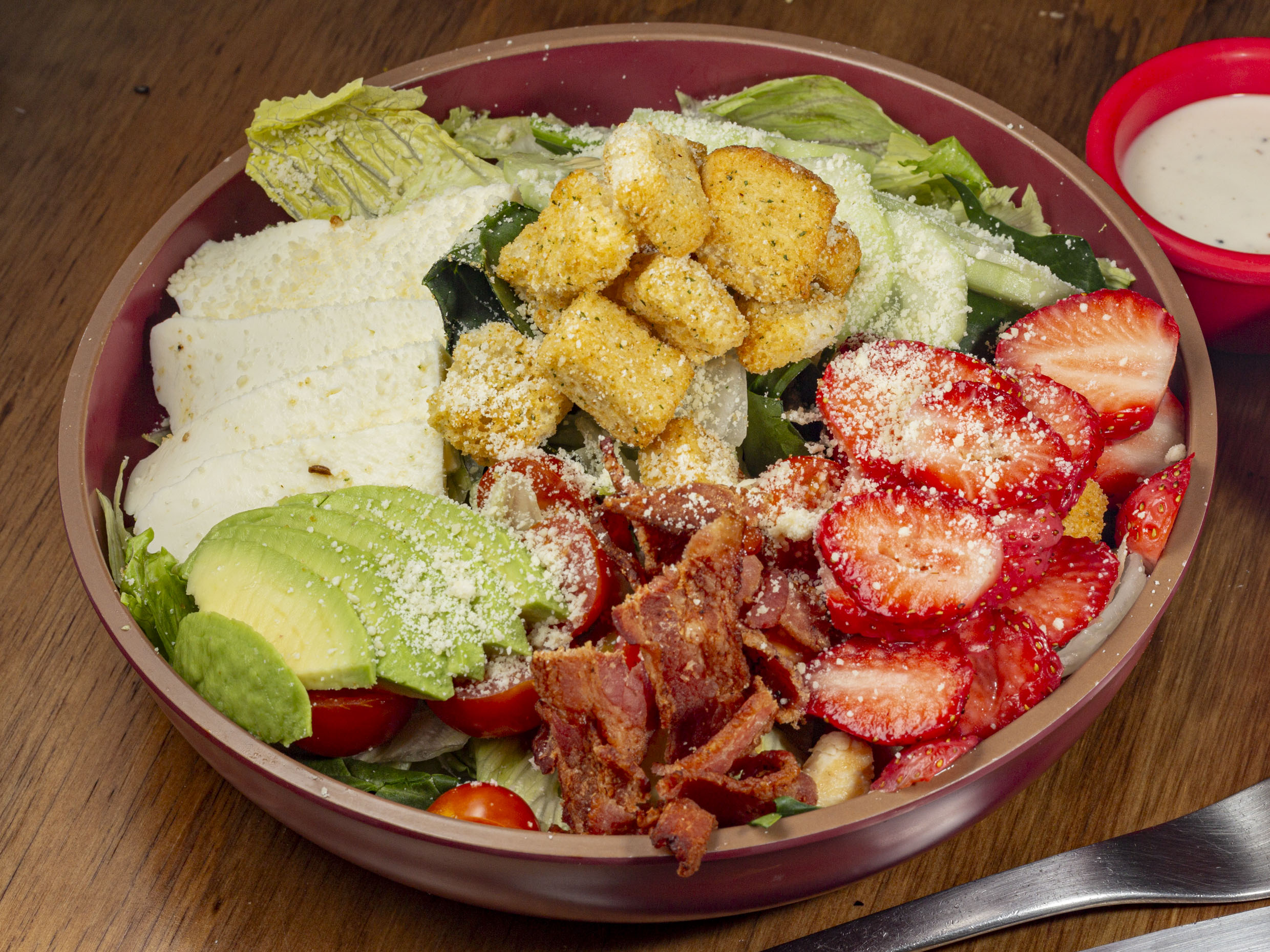 Corazon de lechuga, espinaca, pepino, tomate cherry, panela, aguacate, tocino, fresa, queso parmesano,crutones.