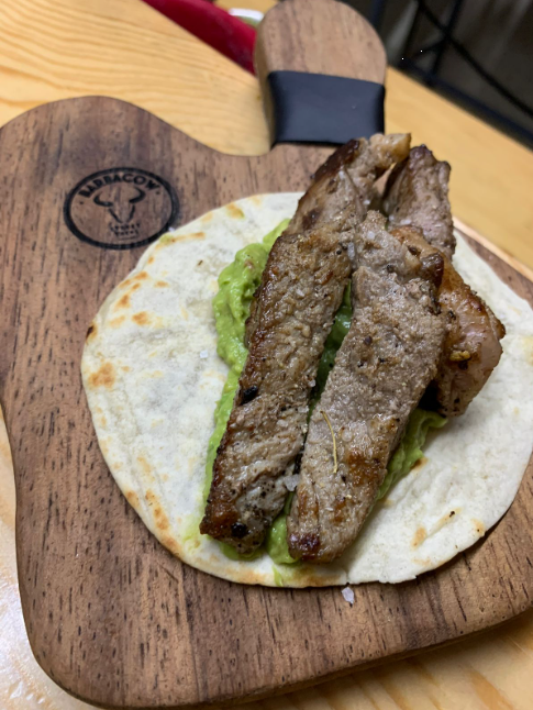 Taco de rib eye, servido en tortilla de harina y guacamole, 100 g.