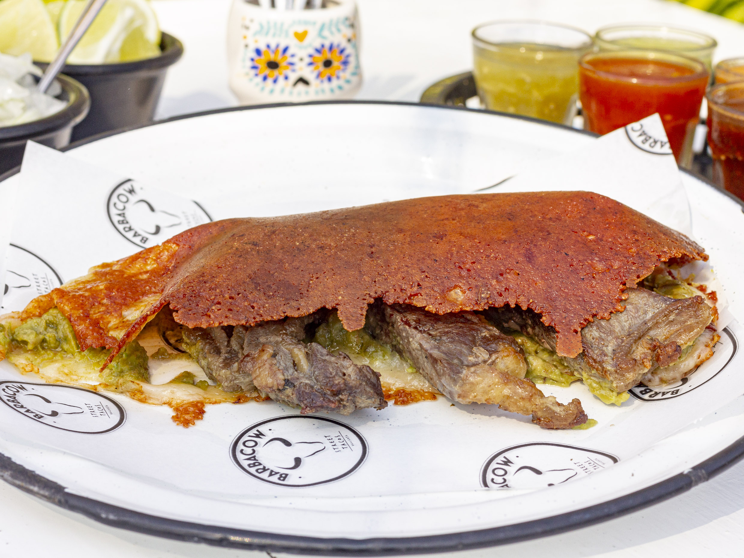 Costra de queso, barbacoa de res y chicharrón prensado, servido en tortilla de maíz azul, 100 g.