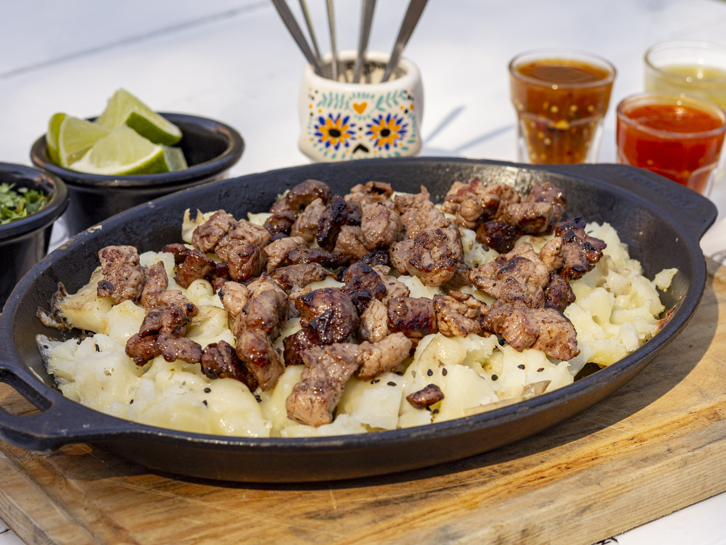 Papa horno servida con 200 gramos de arrachera, mantequilla y queso.