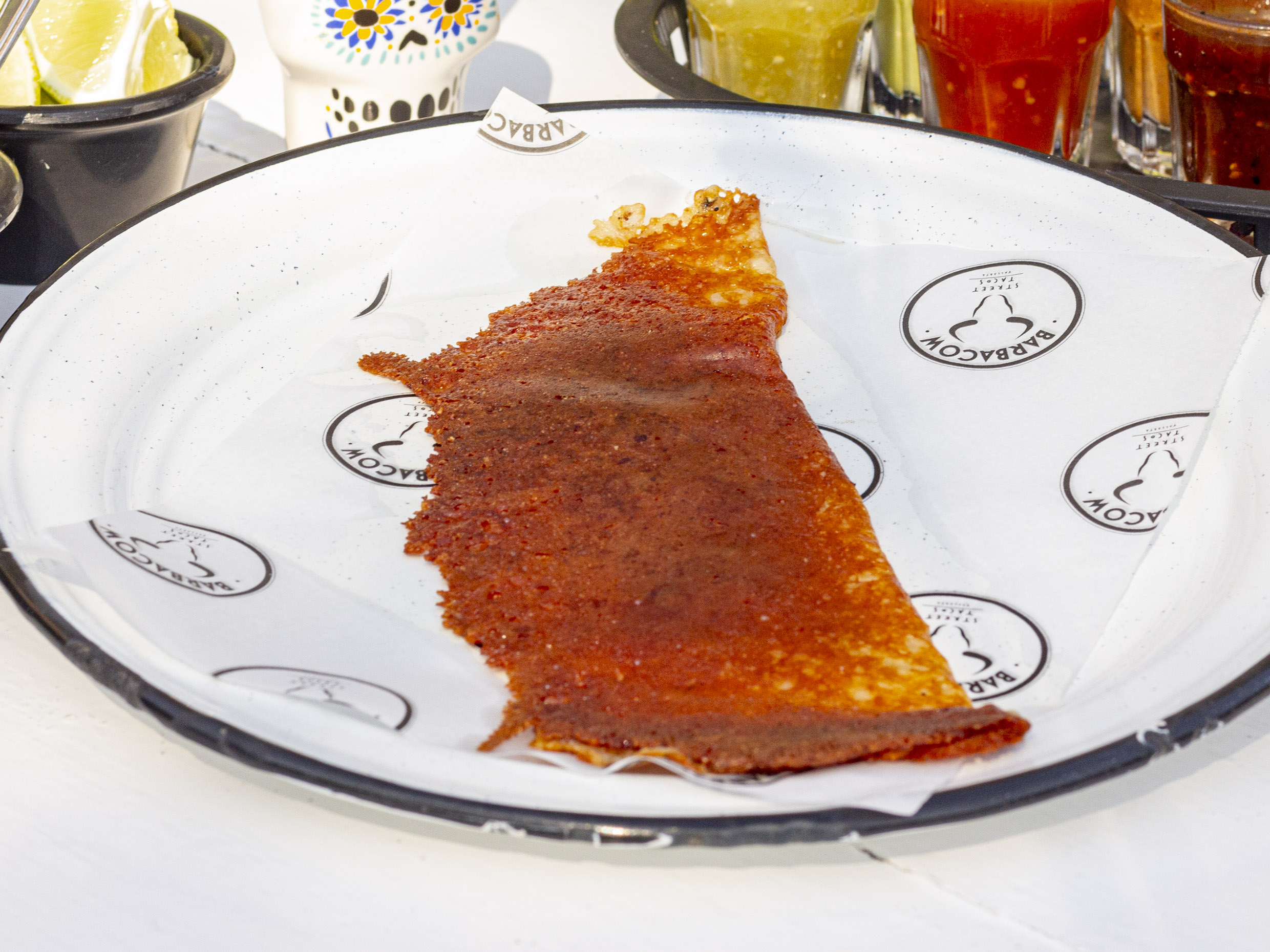 Costra de queso, barbacoa de res y chicharrón prensado, servido en tortilla de maíz azul, 70 g.