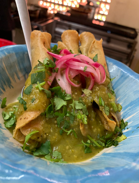 4 Tacos dorados tipo flautas rellenos de barbacoa de res bañados en salsa verde especial.
