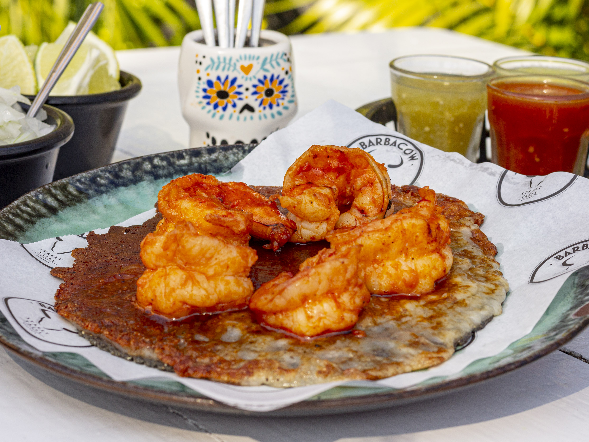 Costra de queso y camarón adobado, servido en tortilla de maíz azul, 70 g.