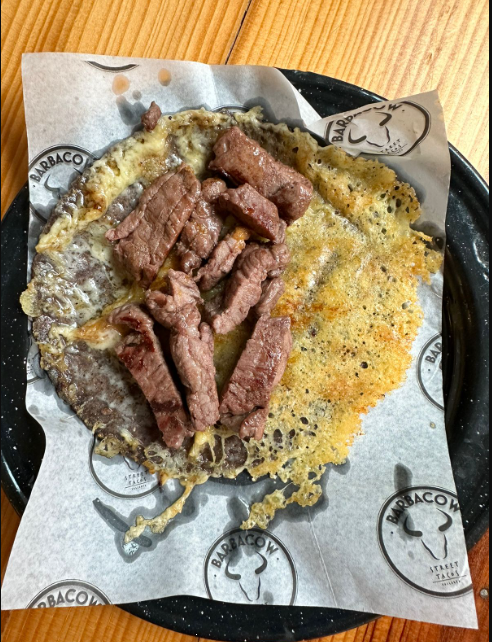 Costra de queso y barbacoa de res, servido en tortilla de maíz azul, 100 g.