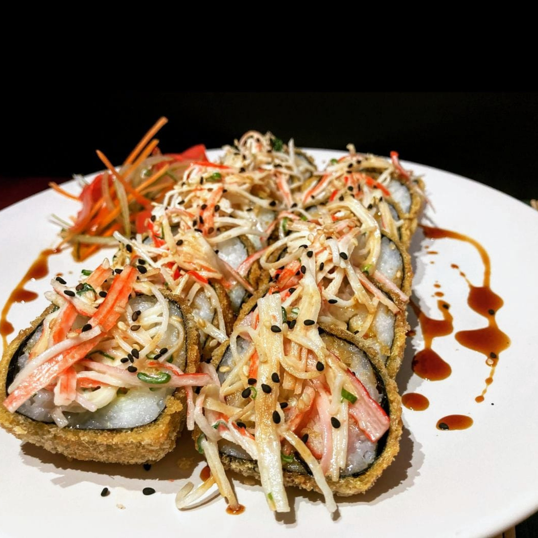 Empanizado y topping de ensalada kani, salsa de anguila y ajonjolí.