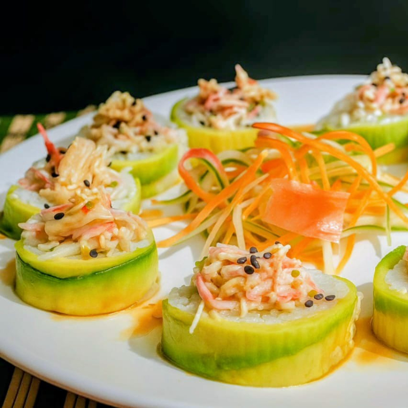 1 pza empanizada rellena de camarón o cangrejo con ensalada de jícama, pepino y jengibre encurtido.